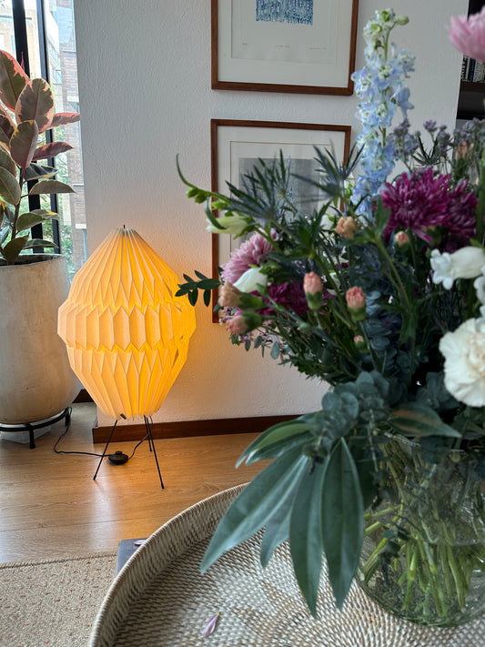 Lámparas de mesa, caperuzas fabricadas en papel 100% natural y bases metálicas.